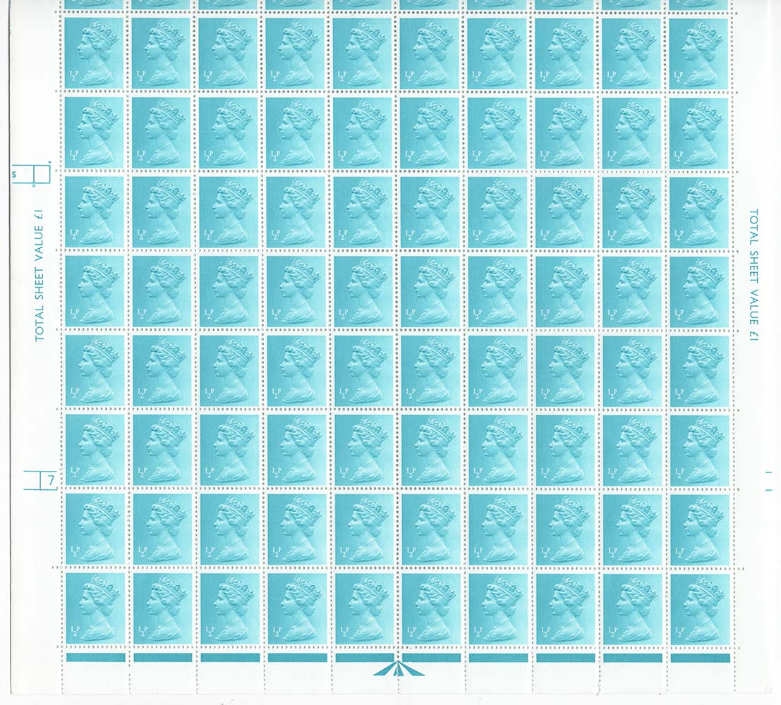 GB 1971 Machin ½p PCP/PVAD cyl 7 no dot with EEH on row 19 in complete unmounted mint sheet of 200, nice study piece sgX924 [ref 293-631/l/ak0268]