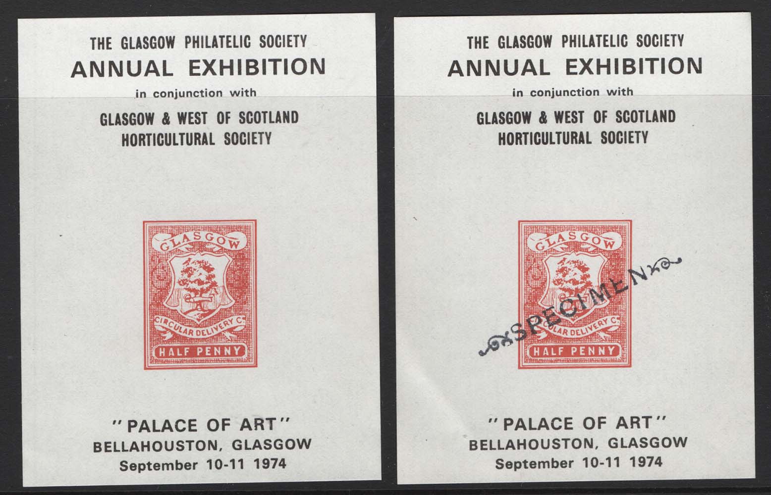 GB 1974 Glasgow Philatelic Exhibition souvenir sheet, ditto overprinted Specimen [ref 293-641/sa/ak0713]