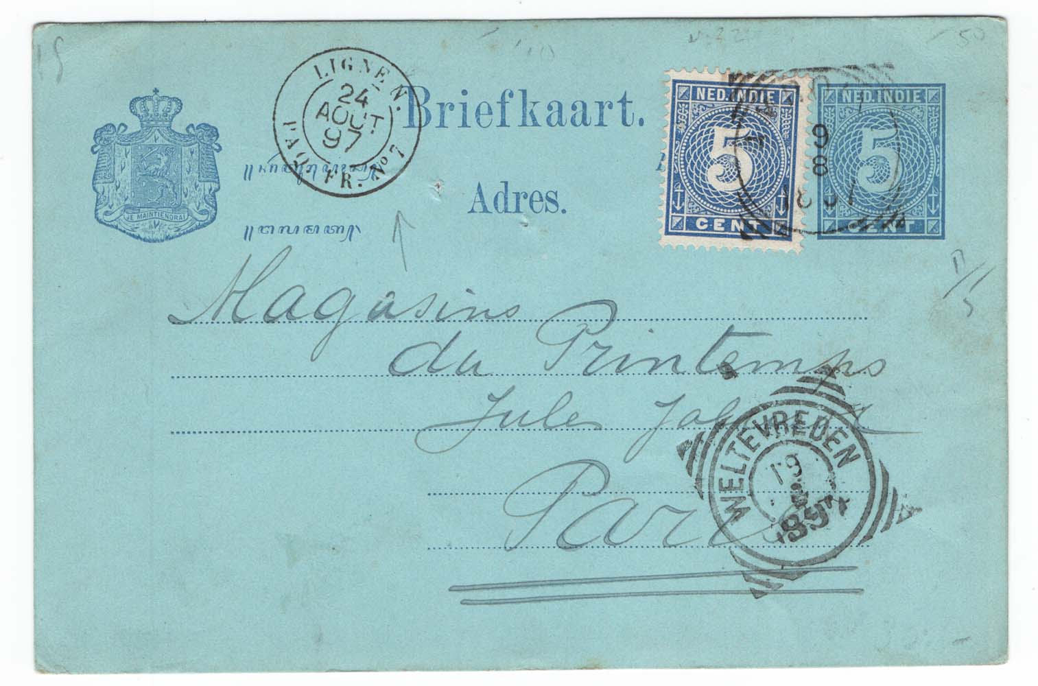 Netherlands Indies 1897 5c blue/blue postal card uprated 5c adhesive to Paris, WELTEVREDEN cds [ref: 294/653 s/am0158]