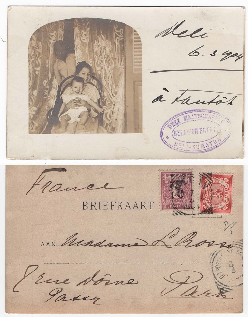 Postcard to Paris franked 3c + 5c, interesting Deli-Sumatra cachet