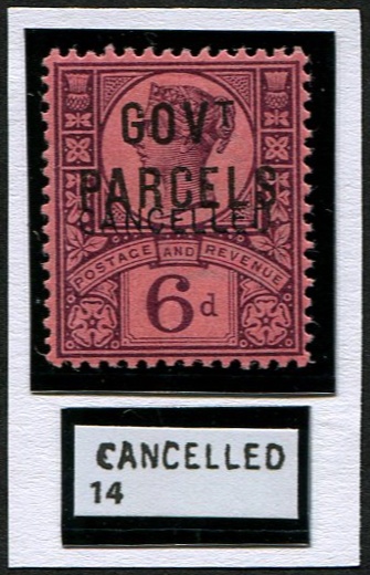 Govt Parcels 6d sgO66 OVPT CANCELLED TYPE 14, um pristine fresh, very scarce, few exist, mainly in poor condition Spec L27t, Wenvoe Cert