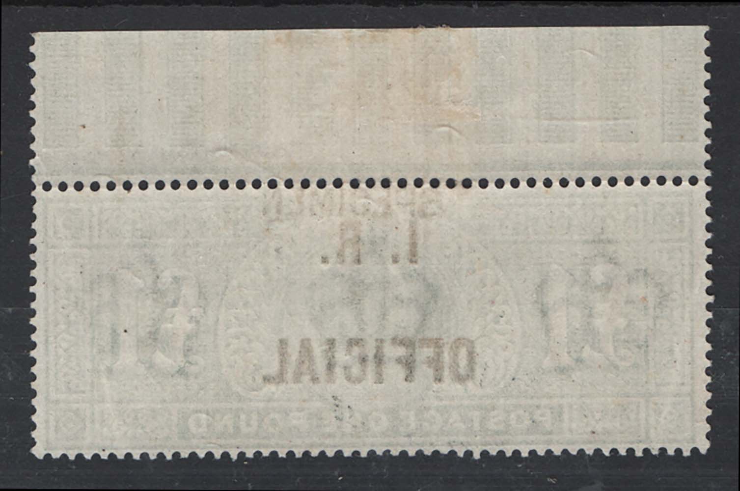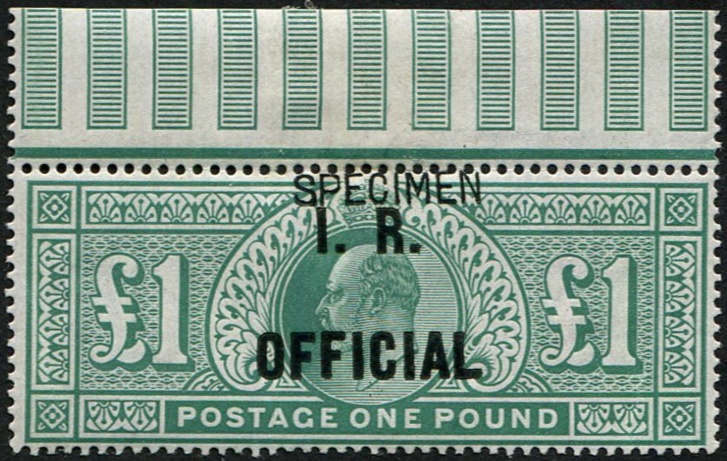 GB Officials 1902 IR, £1 GREEN sgO27s OVPT Specimen TYPE 16, TOP SHEET MARGINAL very fine mint. Rarely seen in fine quality, Spec M08s, BPA Cert [ref 293-681/sb/al101]