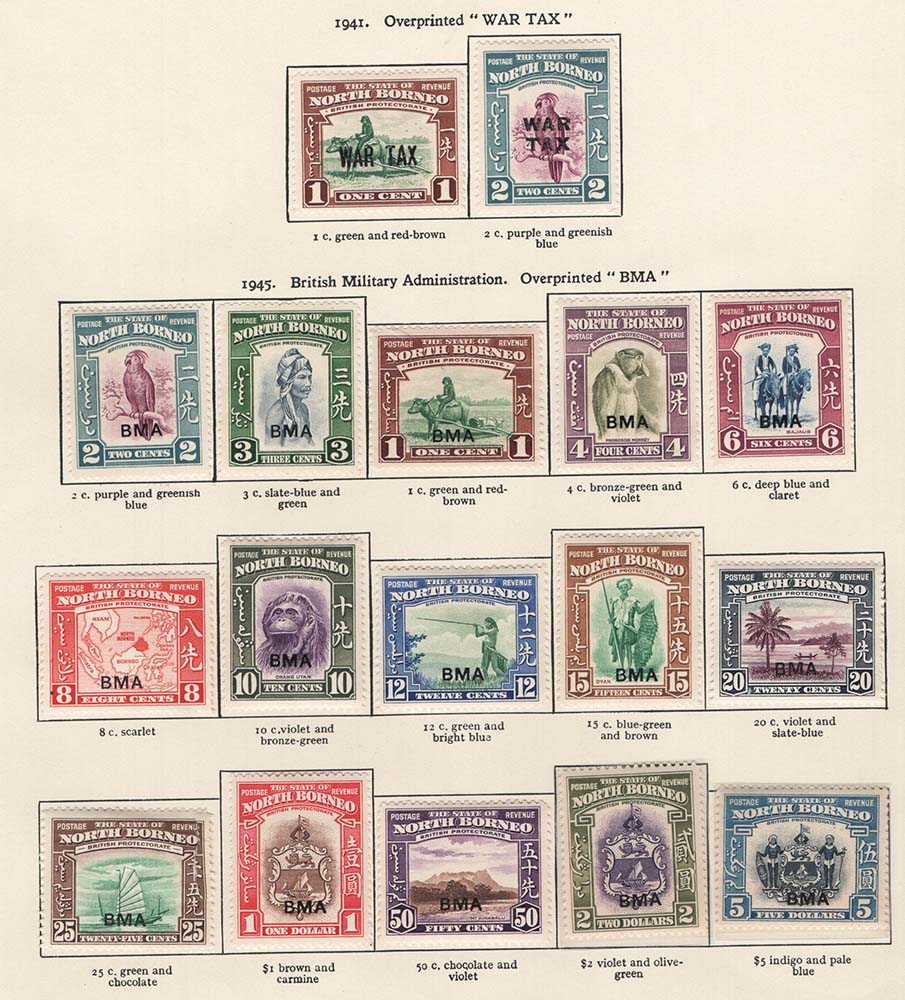 North Borneo 1945 1c – $5 BMA ovpt set of 15 fine mint sg320-334, also the War Tax ovpt pair cat £295 [ref: 294/683 b08/am0233]