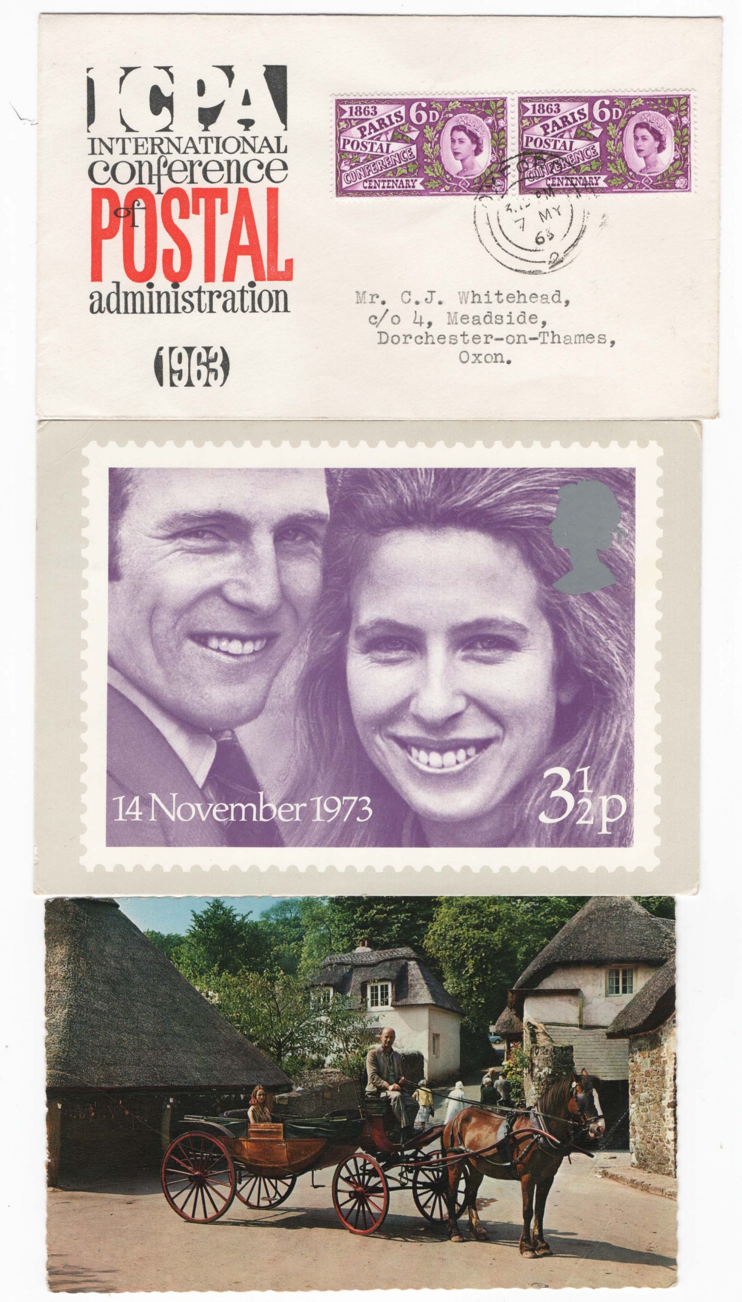 GB 1963 Paris non-phosphor fine FDC also 1973 Royal Wedding PHQ card used on 1st day (this h/addr) sg636+ and PC old scene Cockington Village [ref 290-685/s/ag0492]