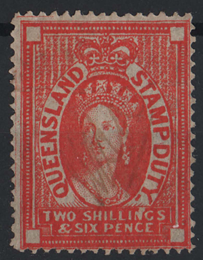 Queensland 1871 2/6d vermilion Stamp Duty, no watermark blue burelé on back sgF29 appears very fine mint but probably cleaned fiscal ‘cat £550’ [ref: 294/704 sa/am0317]