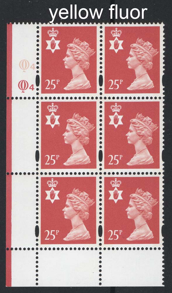 GB Machin Cyl blocks Northern Ireland 25p salmon-pink cyl Q4Q4 yellow fluor MCC cat £75 [ref 293-712/sa/ak0792]