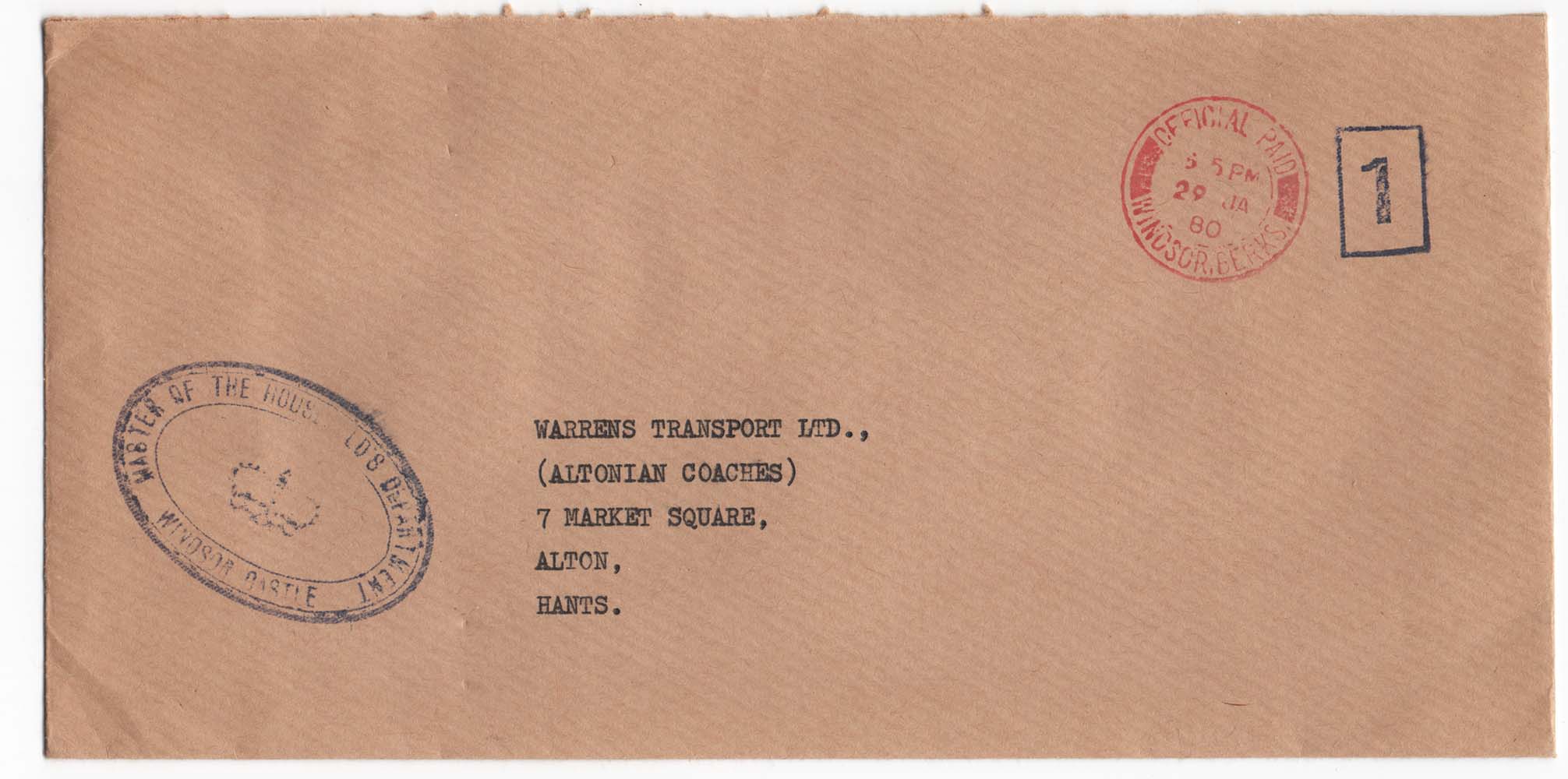 GB 1980 Royal crested official paid cover with ‘Master of the Household’s Department, Windsor Castle’ cachet [ref 291-714/s/ai0418]