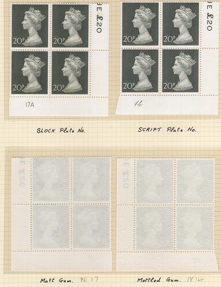 GB 1970 Machin 20p um plate block of 4: plates 14,17A, then plate 14 mottled gum and plate 17 matt gum sg830 [ref 290-715/b07/ag0364]