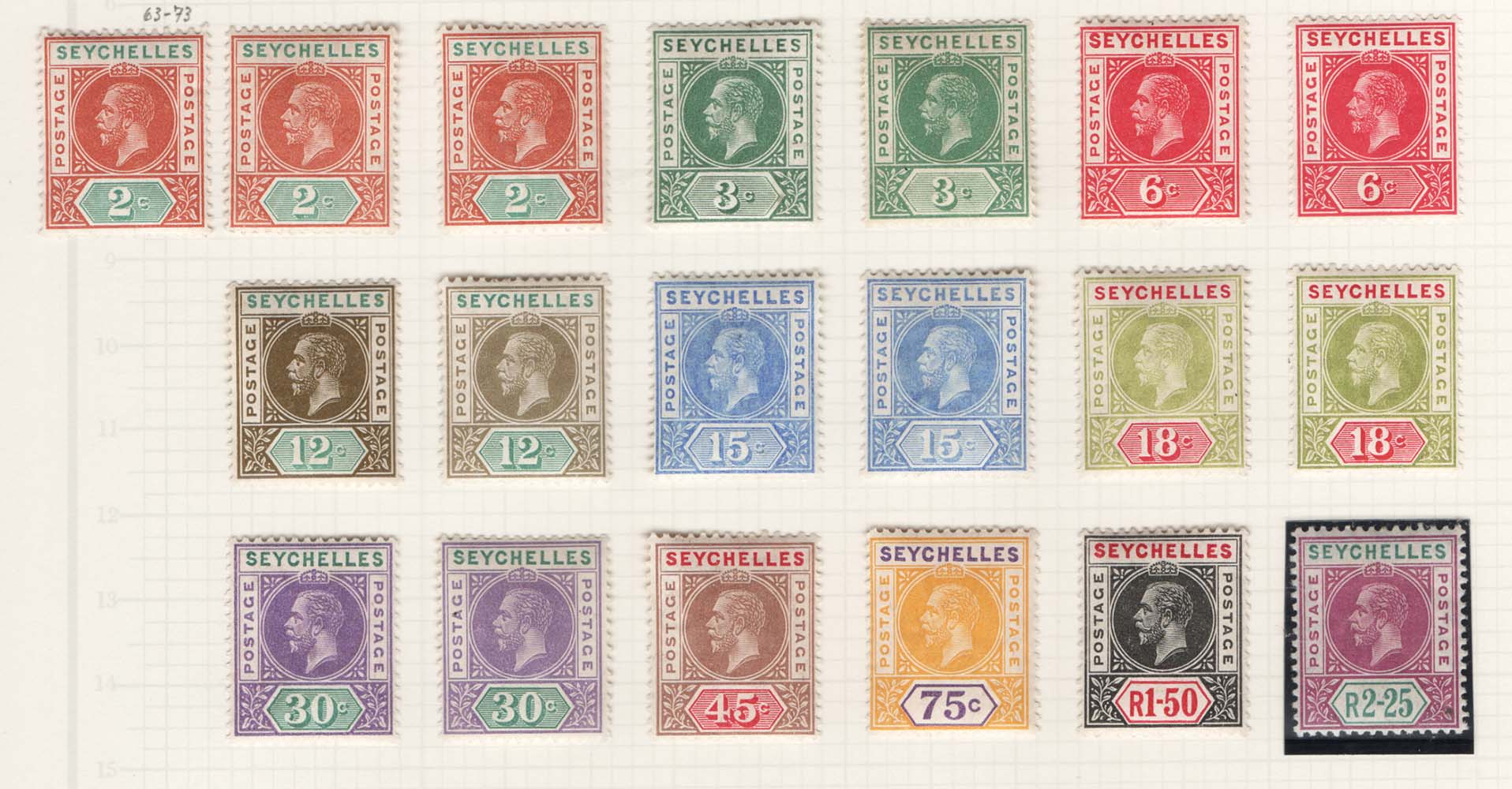 Seychelles 1912 2c – 2r25 set of 11 very fine mint sg71-81 with duplicates up to 30c (not sure why) cat £149 [ref: 294/715 b08/am0336]