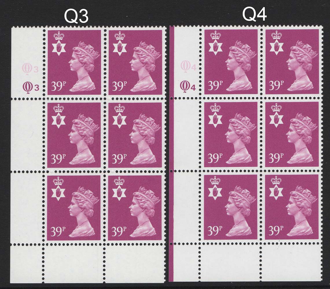 #716 GB Machin Cyl blocks Northern Ireland 39p cyl Q3Q3 & Q4Q4