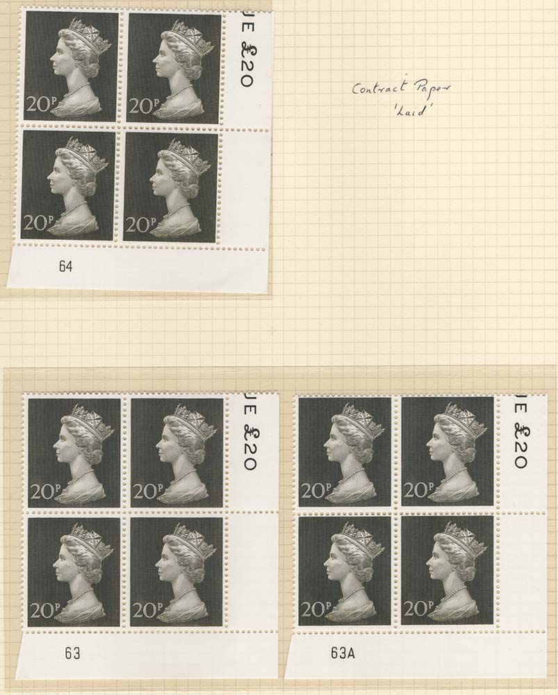 Machin 20p um plate block of 4: plates 63, 63A, 64 contractor’s paper sg830