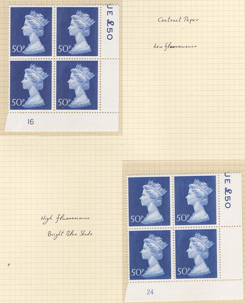 GB 1970 Machin 50p um plate block of 4: plate 16 low fluor, plate 24 bright blue shade, high fluorescence sg831 [ref 290-719/b07/ag0357]