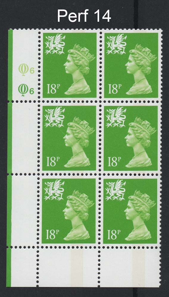 Wales 18p bright green CB perf 14 cyl Q6Q6 with pre-print paper crease on r19/1