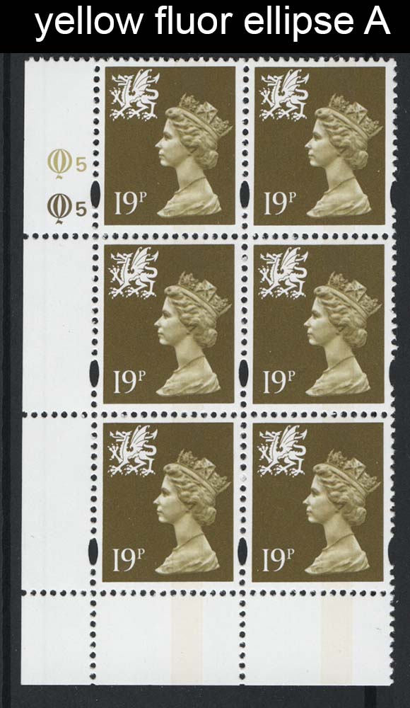 Wales 19p olive-green cyl Q5Q5 yellow fluor ellipse type A, MCC c£125