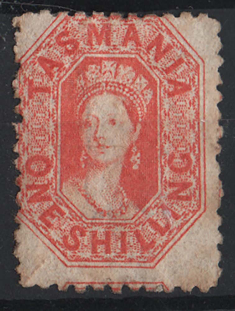 Tasmania 1863 1s vermilion, perf 12, double line watermark sg77 fresh mint, a little heavily mounted cat £500 [ref: 294/734 sa/am0307]