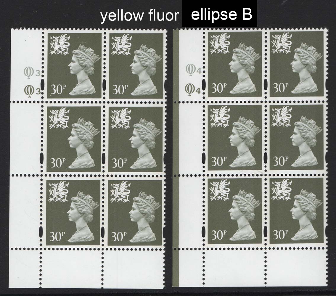 Wales 30p grey-green cyl Q3Q3 yellow fluor ellipse type B, ditto Q4Q4 MCC c£55