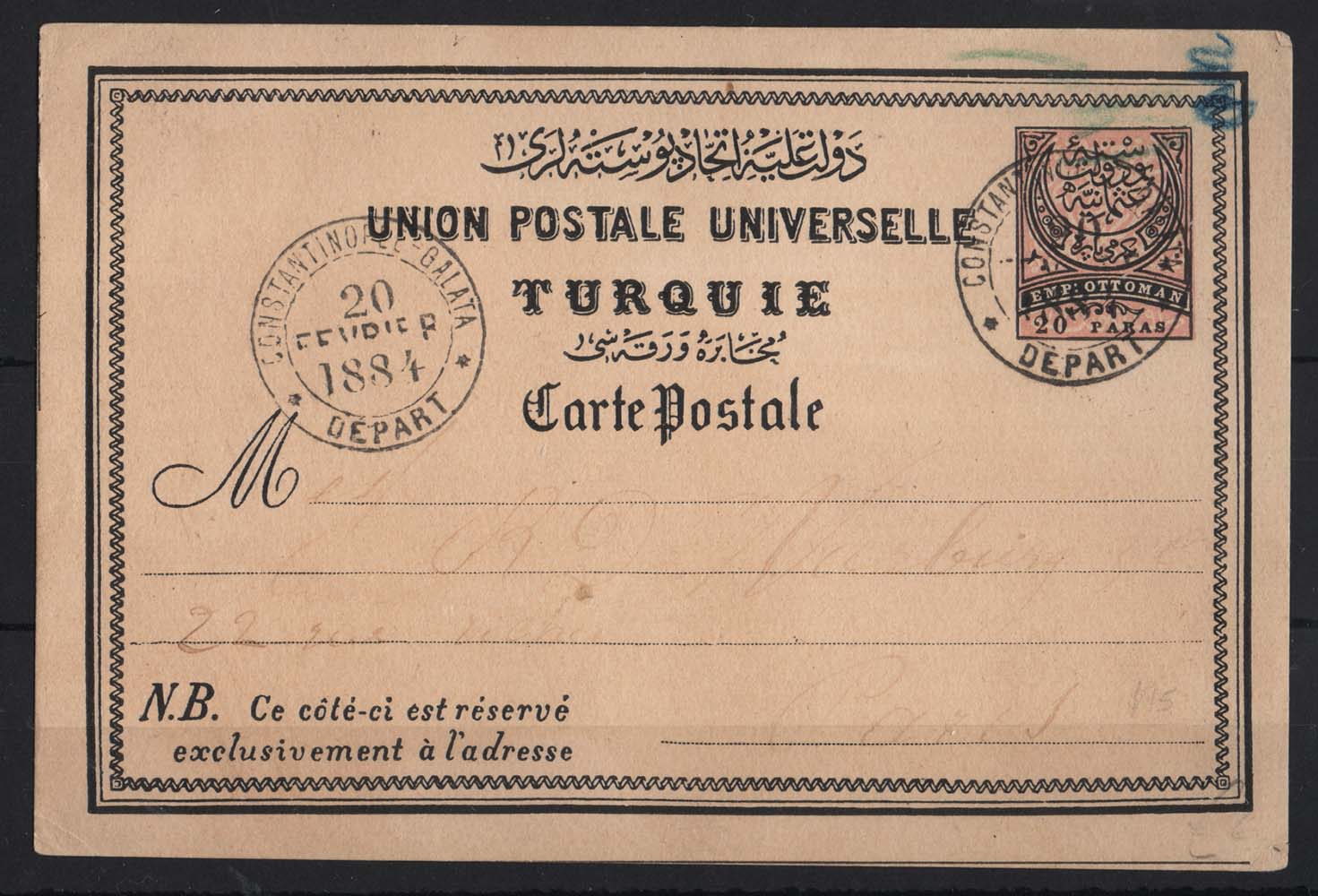 20 paras black & rose UPU postal card fu to Paris, address & message faint, neat cancels