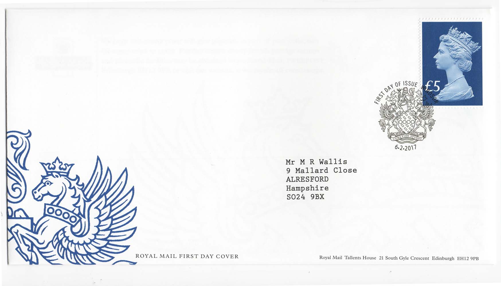 GB 2017 Machin £5 sapphire FDC, Windsor h/stamp sgU3920 [ref 291-754/s/ai0040]