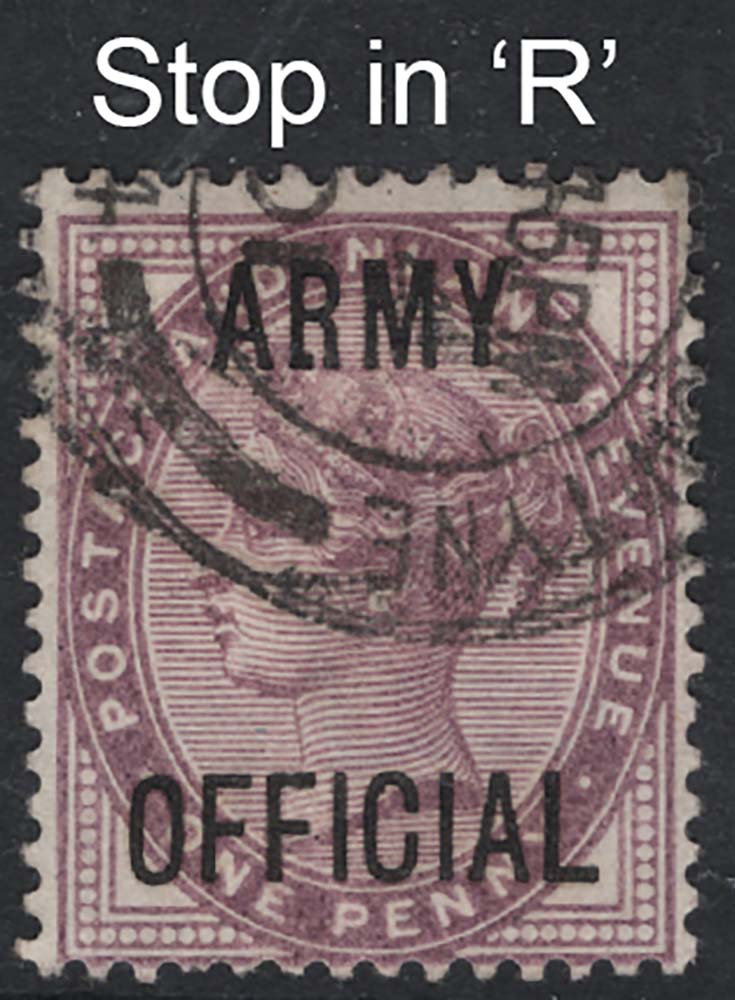 GB Officials 1882 1d lilac Army Official sgO43 fine used cds variety stop between legs of R Spec L38e [ref 291-762/l/ai0115]