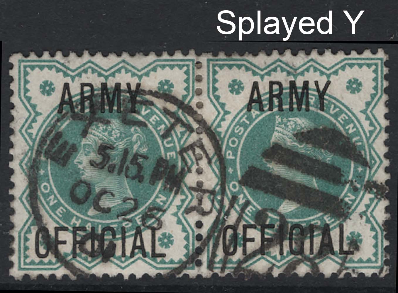 GB Officials 1900 ½d blue-green Army Official sgO42 fine used in pair, variety Splayed ‘Y’ Spec L37h [ref 291-780/l/ai0119]