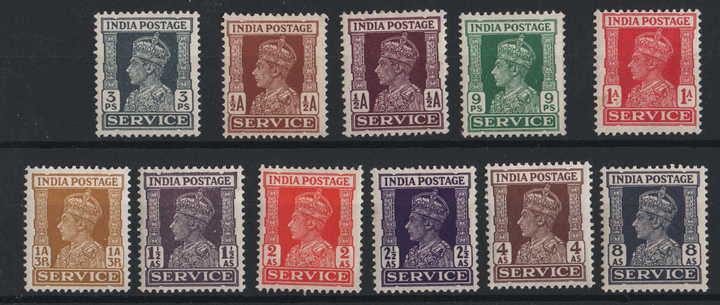 India 1939 Officials set of 11, 3p – 8a very fine mint (1a gum bend) sgO140-O150 [ref 293-782/sa/ak0178]