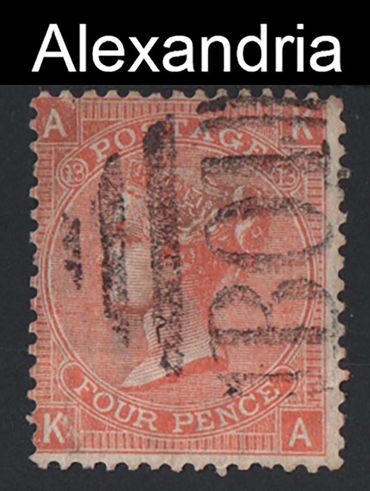 GB Used Abroad 1865 4d vermilion plate 13 vfu, crisp B01 Alexandria, Egypt
