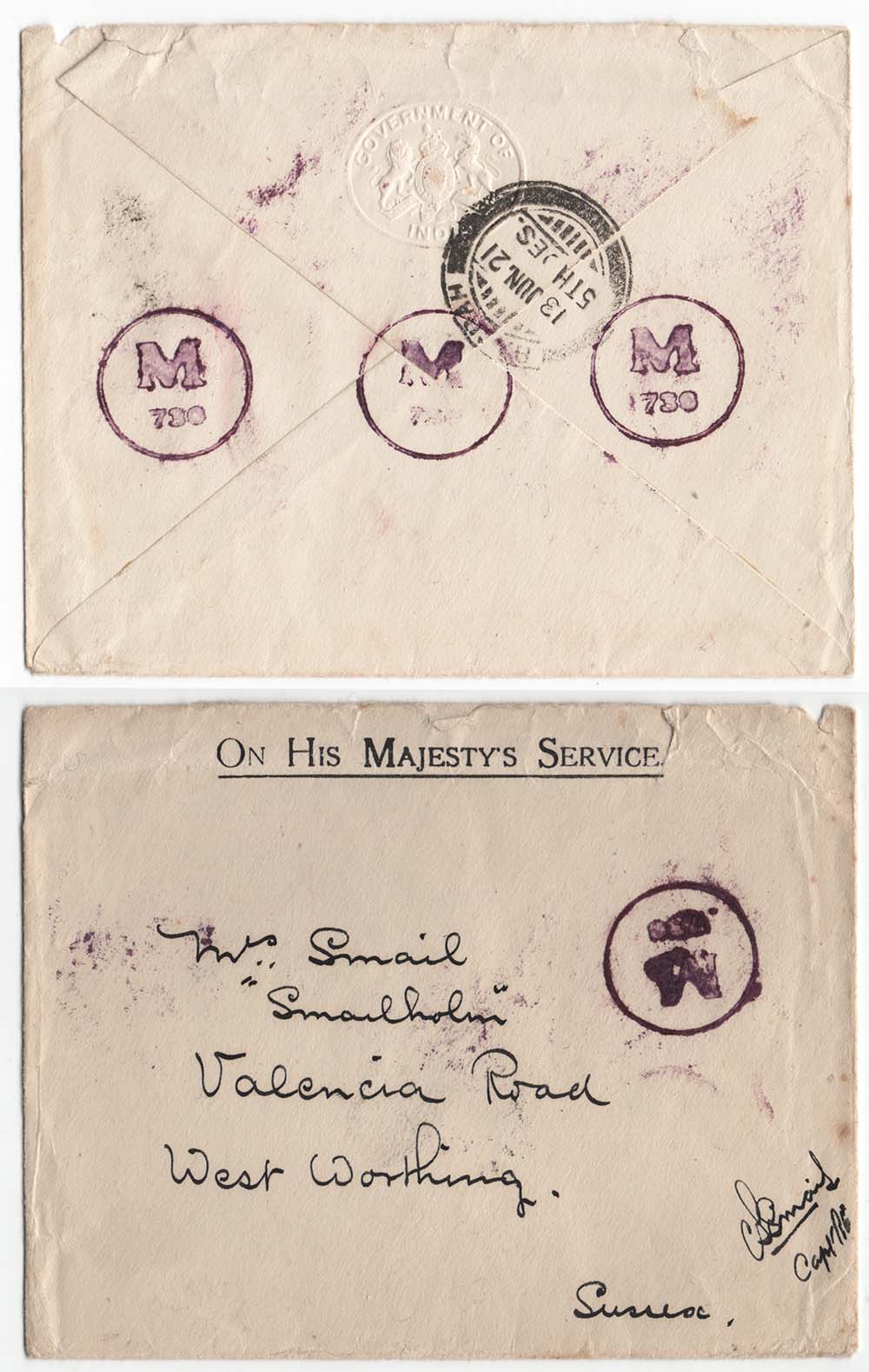 India 1921 OHMS Gov’t of India embossed envelope to Sussex with ‘M/730’ in circle cancels