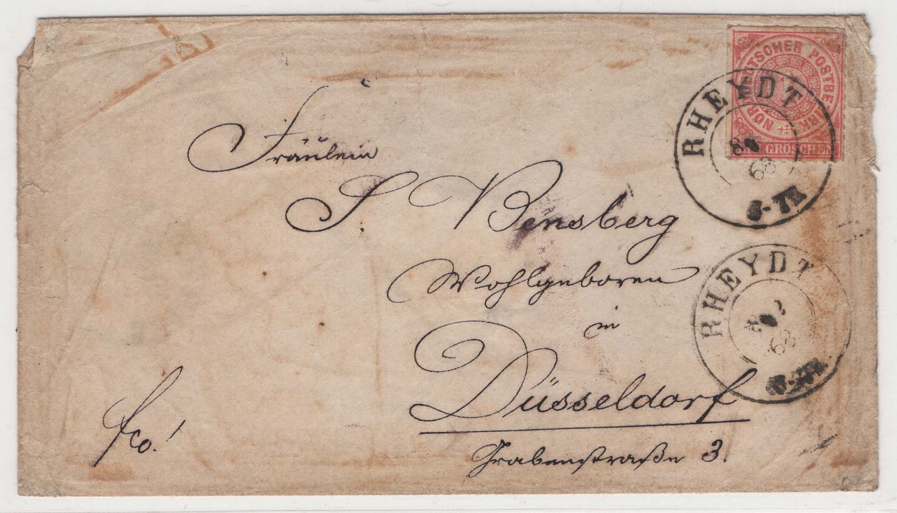 North German Confederation 1g rose sg6 on cover, RHEYDT to Dusseldorf