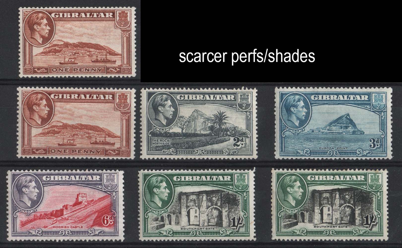 Gibraltar 1938 1d p13½ wmk s/w, p13, 2d p13½, 3d greenish-blue, 6d p13 grey-violet, 1s p14, p13½, sg122ab, 122d, sg124a, 125bb, 126c, 127, 127a g-f mint c£160+ [ref 290-835/sa/ag0219]