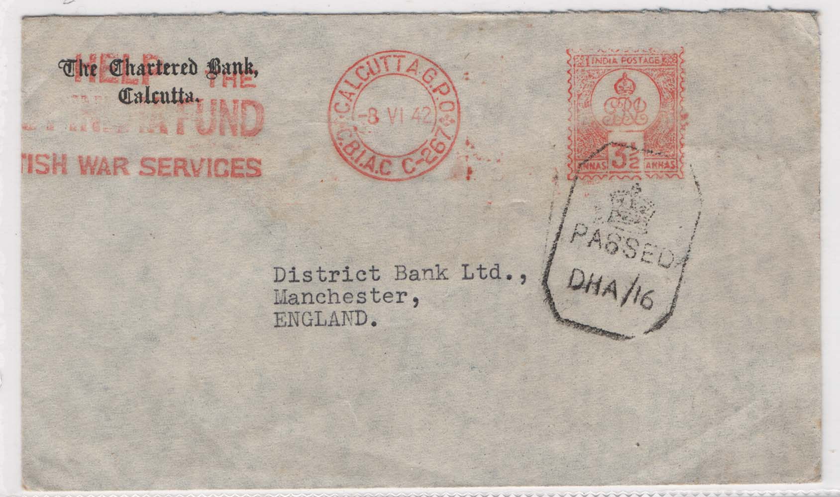 India 1942 WW2 censored cover to Manchester, 3½a meter mark & Help the India Fund British War Service slogan [ref 291-865/s/ai0224]