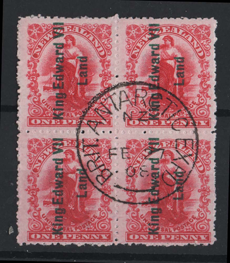 New Zealand 1908 Shackleton Antarctic Expedition 1d rose-carmine ovpt King Edward VII Land sgA1, ROYLE plate very fine used block of 4 cat £200 as singles [ref 293-867/sa/ak0691]