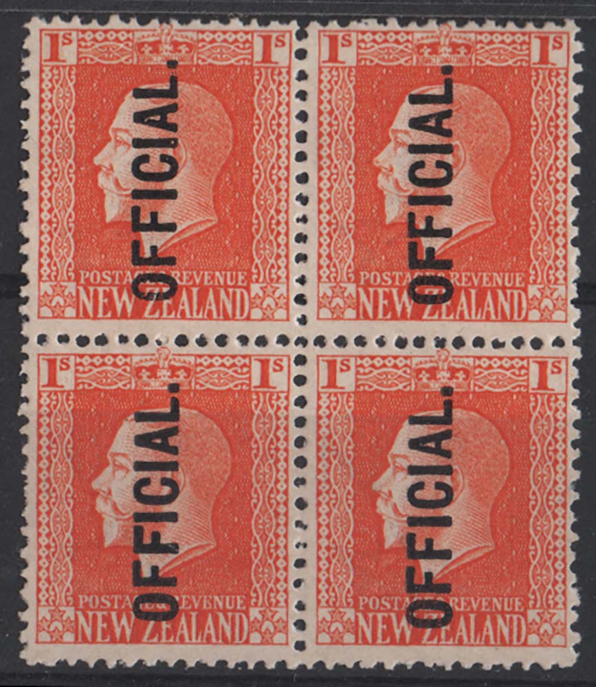 New Zealand 1915 1s orange-vermilion Official perf 14×13½ sgO105 fine mint block of 4 (3x um) cat £128 as mm CP KO12a [ref 293-871/sa/ak0353]