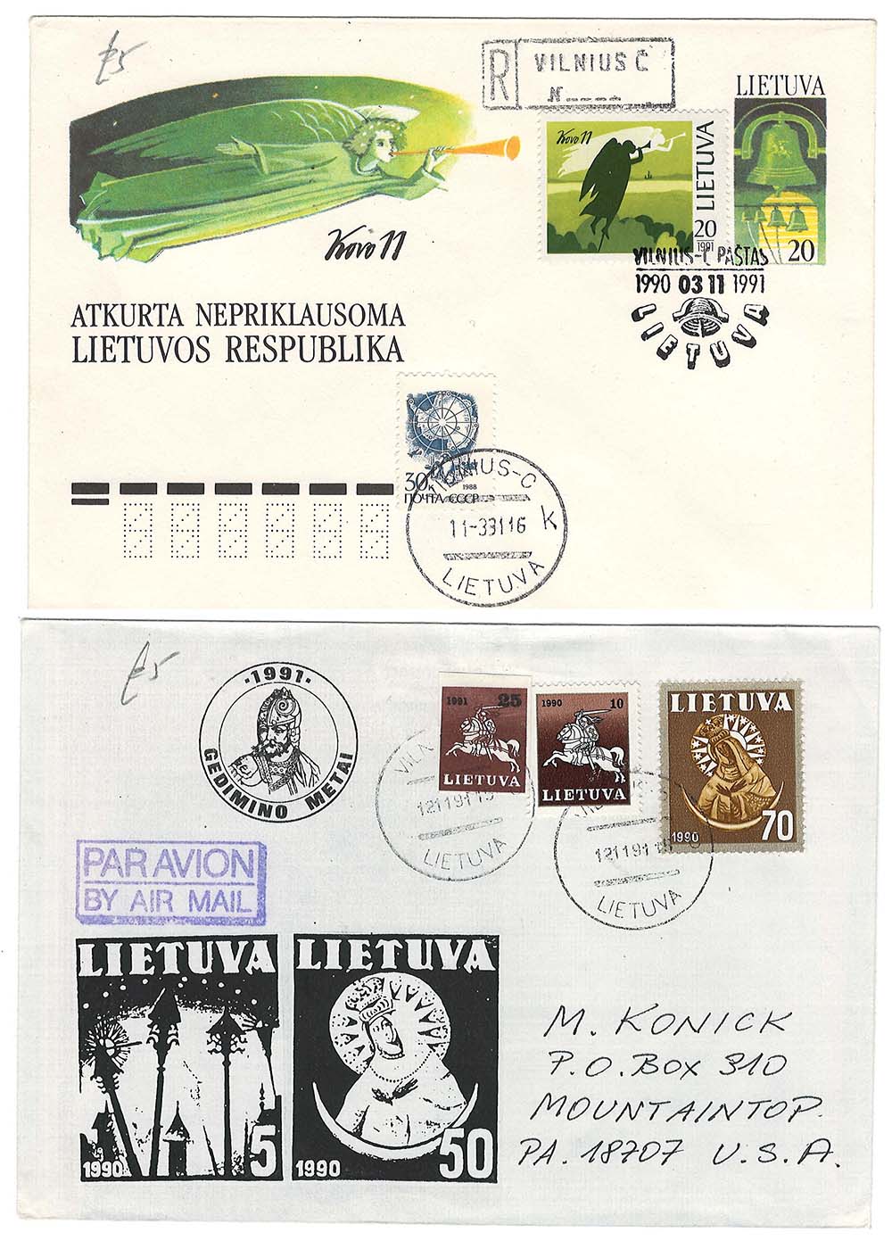 Lithuania 1990 First Republic issue 5k, 10k illustrated FDC + Neat airmail cover to USA GEDIMINO METAI [ref 291-884/a16/e3421]
