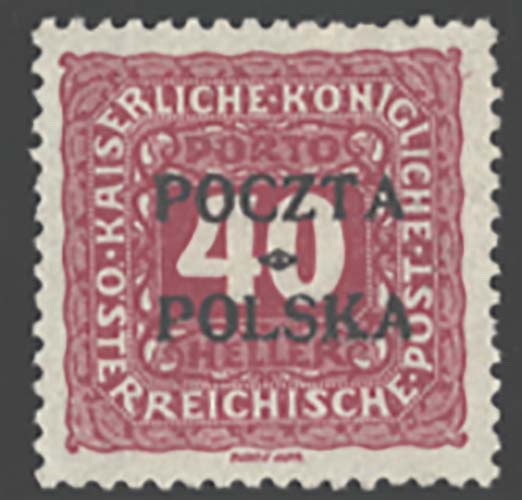 Poland 1919 40h carmine postage due as sgD56 fine mint with forged POCZTA/POLSKA ovpt ‘cat £425’ RPS cert [ref 293-892/s/8m0379]