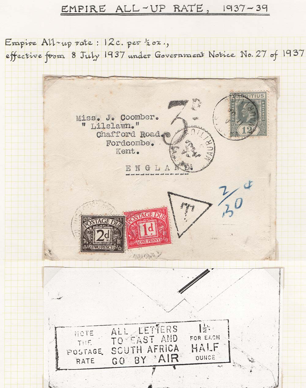 Mauritius 1937 Underpaid Airmail cover to England franked 12c, charged 3d