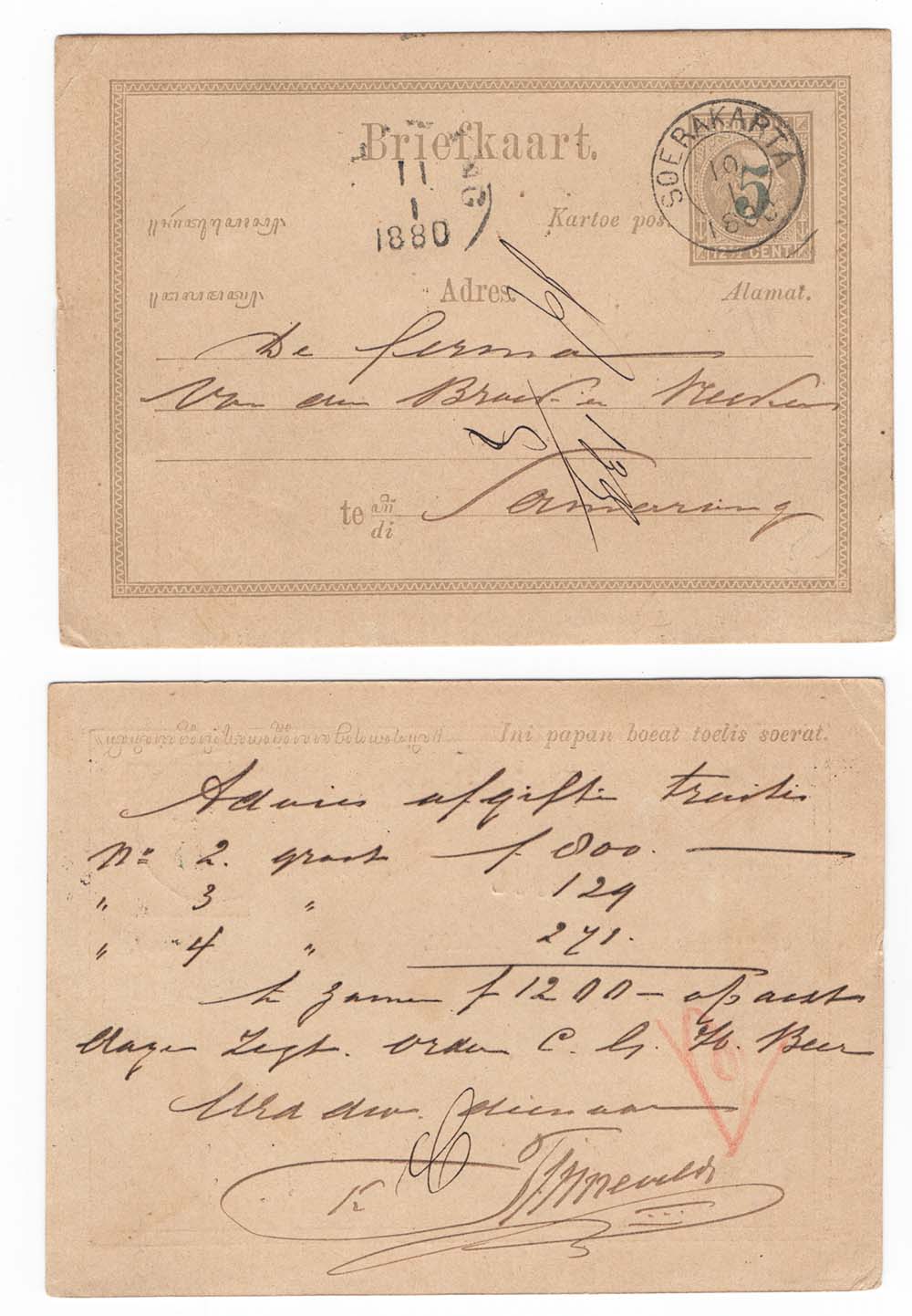 Netherlands Indies 1880 Neat 5 on 12½c postal card, fine used, crisp SOERAKARTA cds [ref 291-902/s/ai0034]