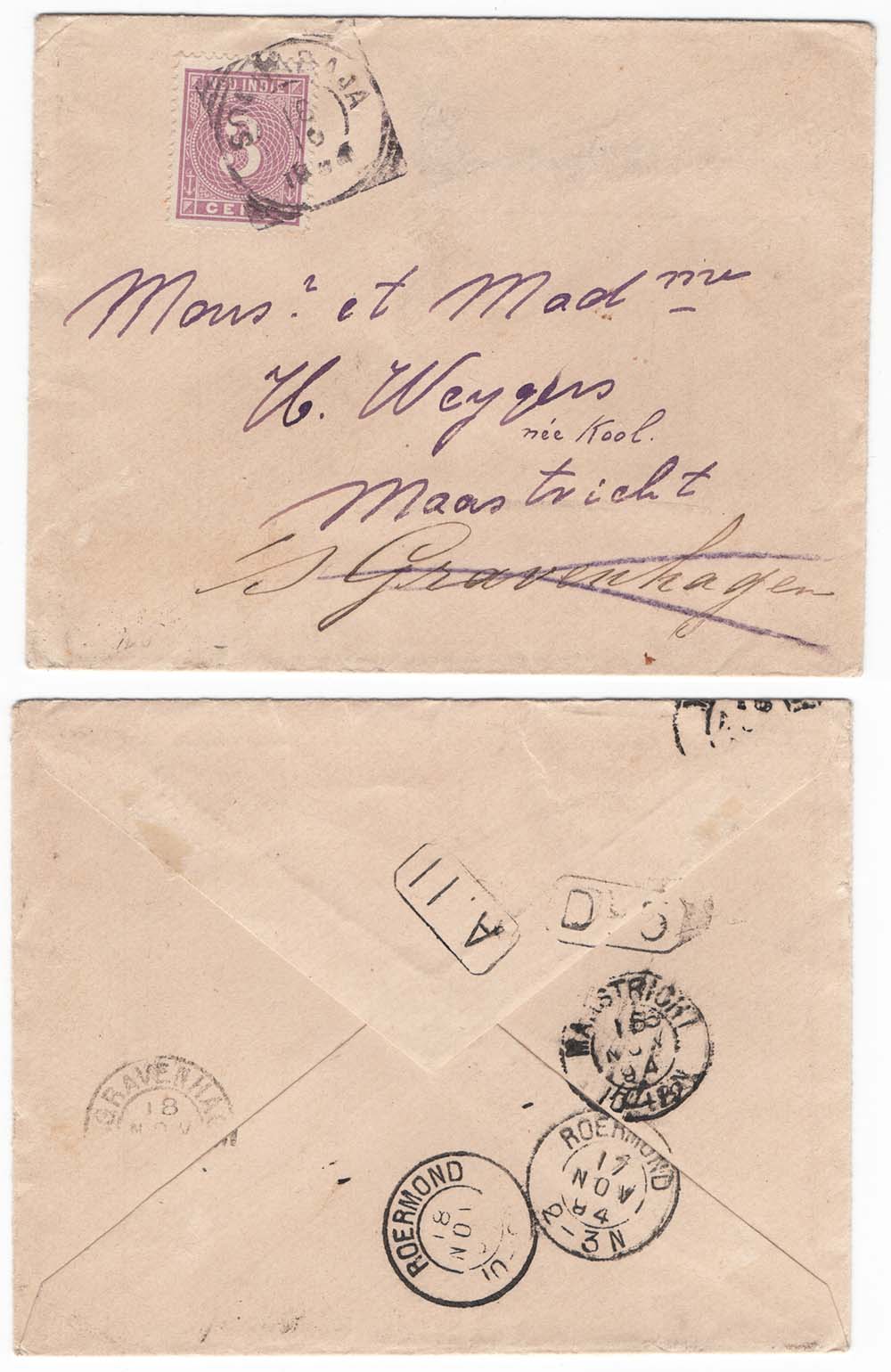 Netherlands Indies 1884 Neat cover to Maastricht franked 3c sg90c [ref 291-904/s/ai0033]