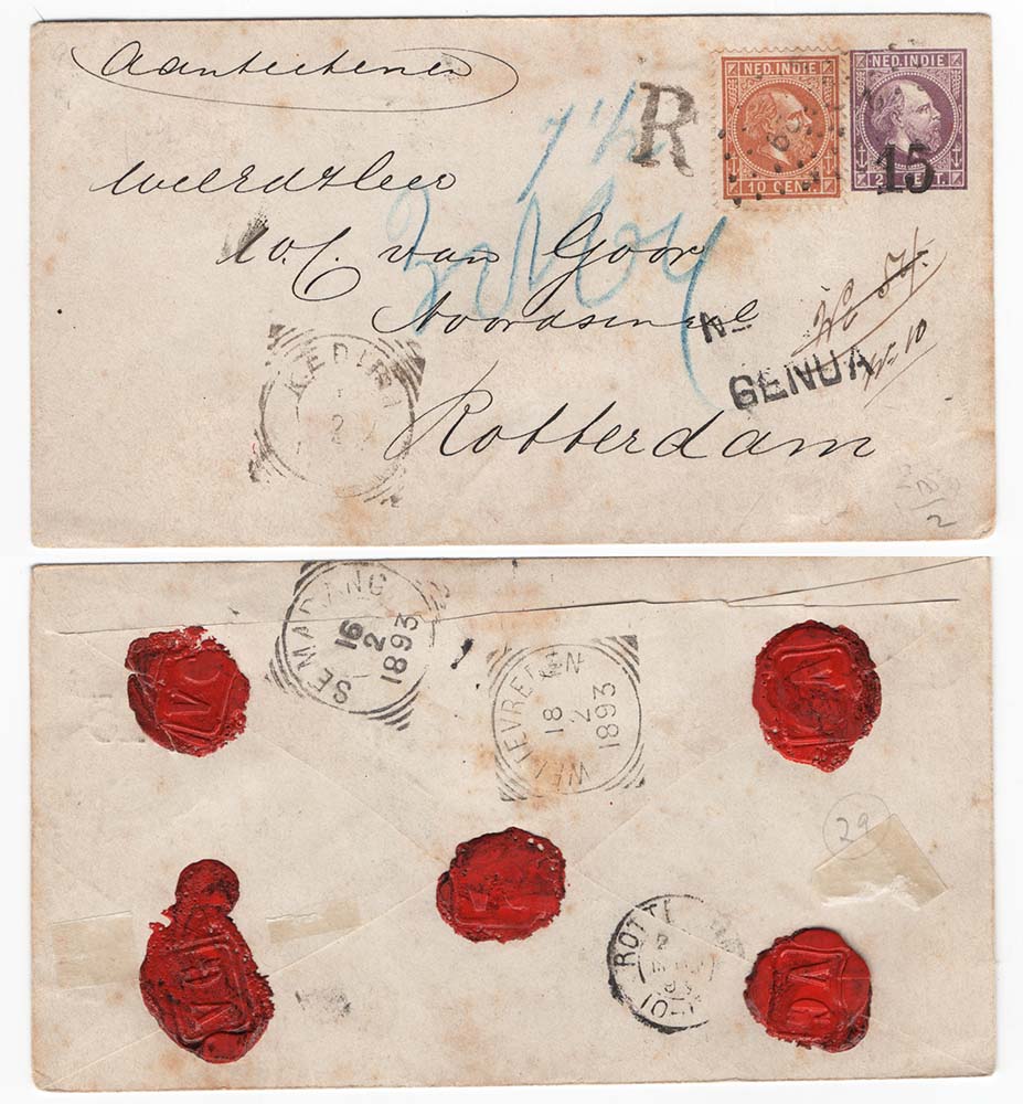 Netherlands Indies 1893 Neat 15 on 25c purple registered stationery envelope uprated 10c adhesive KEDIRI to Rotterdam [ref 291-905/s/ai0037]