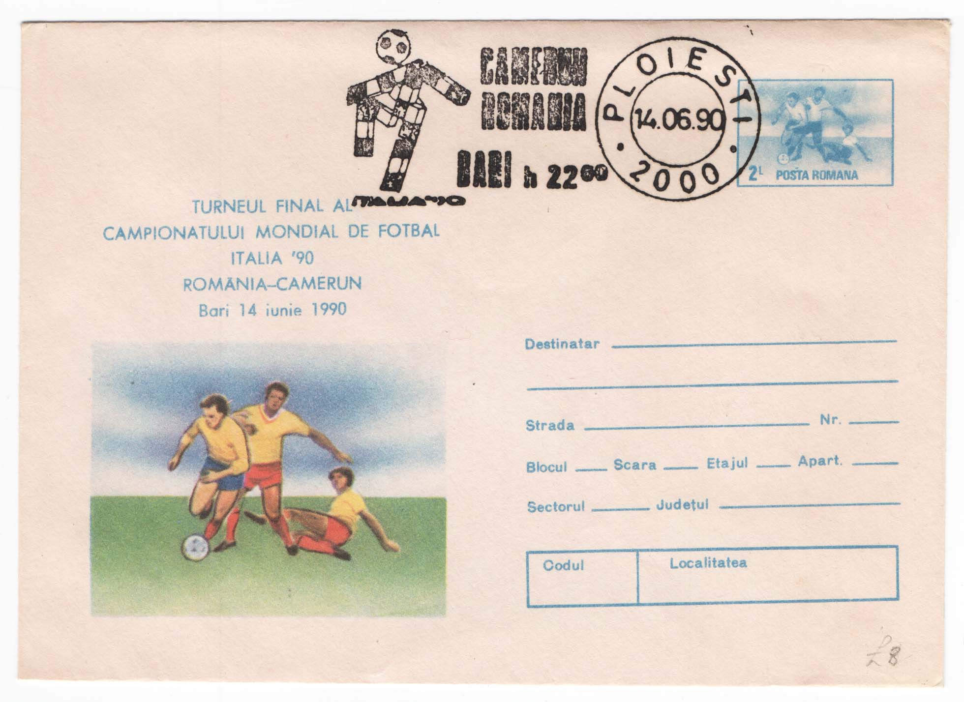 Football World Cup Italia90 2L special postal envelope for Romania-Cameroun match vfu special cancel