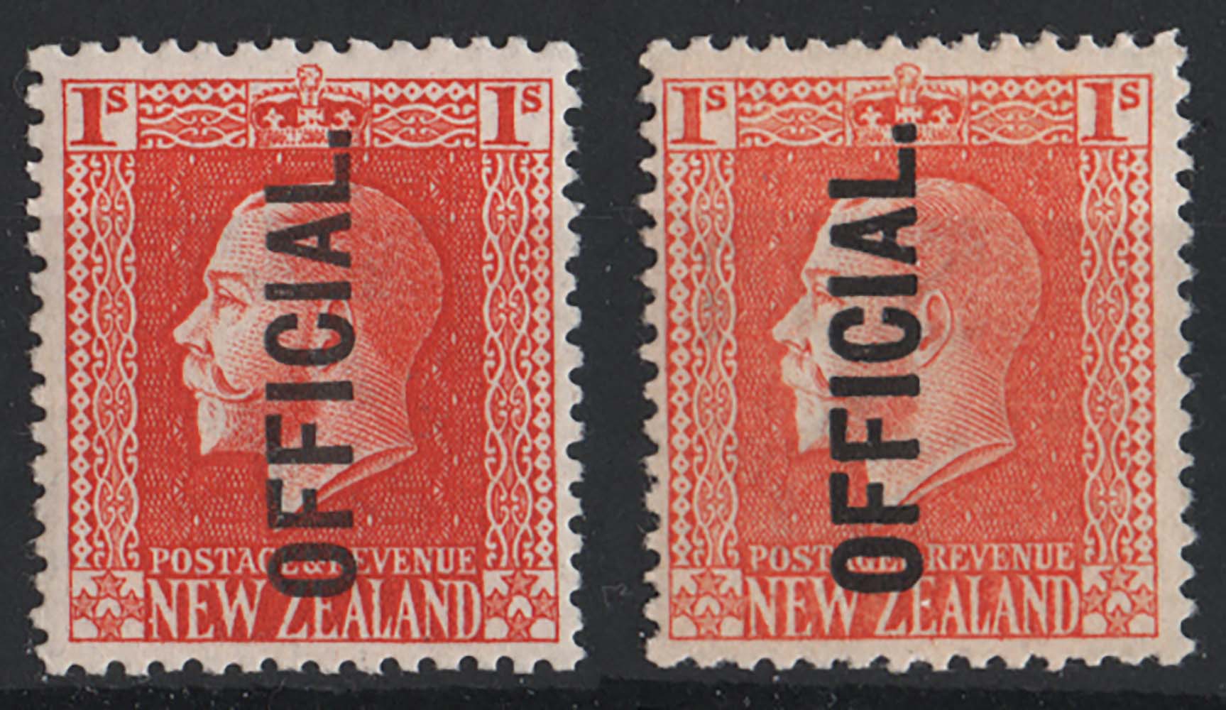 New Zealand 1915 Cowan unsurfaced paper Officials perf 14×14½ 1s vermillion, ditto pale orange-red very fine mint sgO105.O105b cat £55 [ref 291-914/sa/ai0403]