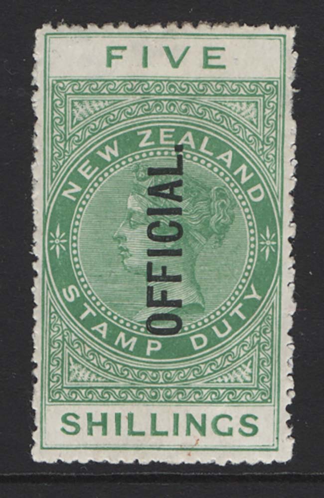 New Zealand 1915 5s yellow-green Official De La Rue paper, rough perf 14 mint sgO83 cat £120 [ref 291-918/sa/ai0386]