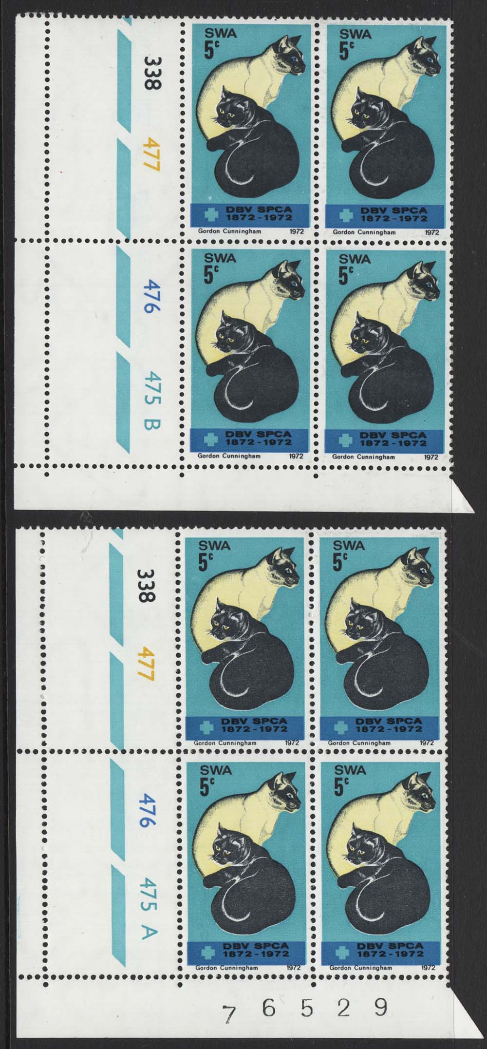 South West Africa 1972 Cats 5c, sg234, in two different cylinder blocks of 4 unmounted mint cat £30 as singles animals thematic [ref 293-923/sa/ak0555]