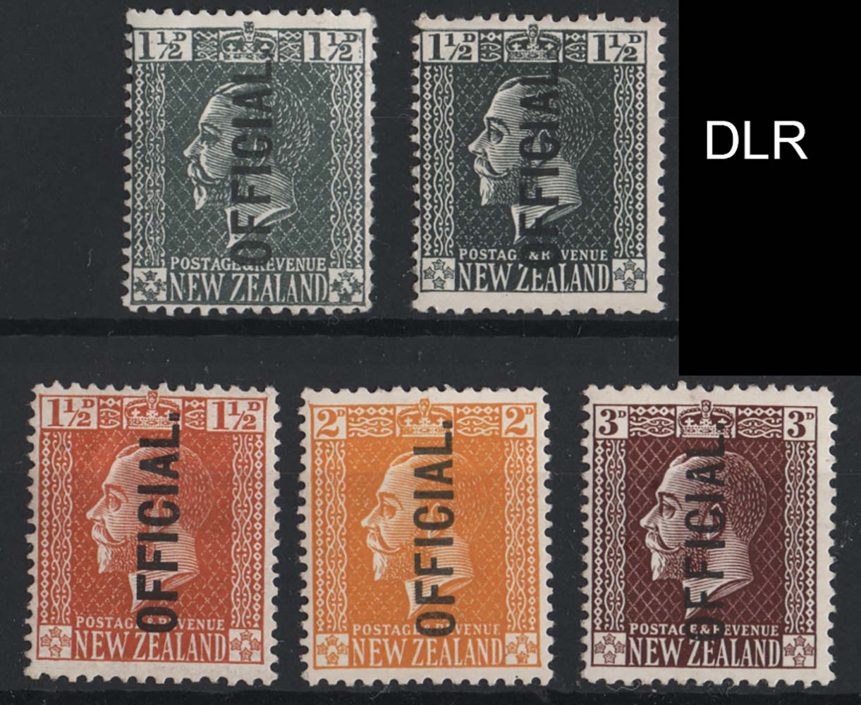 New Zealand 1915 Officials: 1½d slate, 1½d grey-black, 1½d orange-brown, 2d, 3d De La Rue paper sgO89-93 fresh m/mint (set less cheap ½d) cat £45+ [ref 291-926/sa/ai0397]