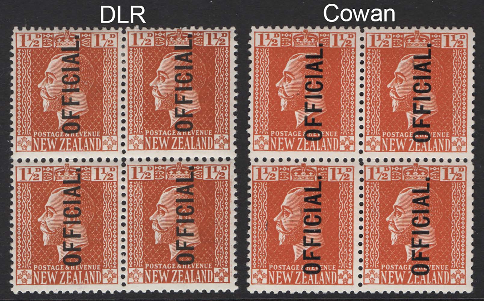 New Zealand 1915 1½d orange-brown Official De La Rue paper sgO91 very fine mint block of 4 (2x um), ditto thick Cowan paper sgO97 cat £142 [ref 291-927/sa/ai0389]