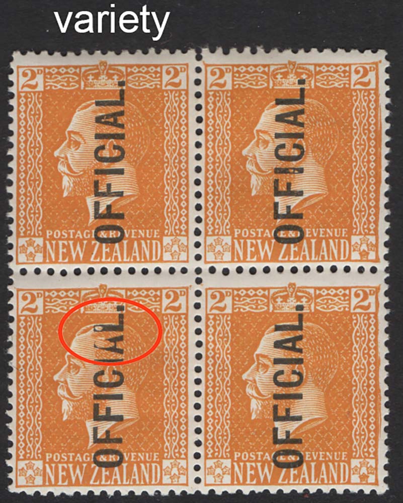 New Zealand 1915 2d yellow Official De La Rue paper sgO92 fine mint block of 4 (2x um) one with damaged AL of Official variety cat £40++ [ref 291-928/sa/ai0390]