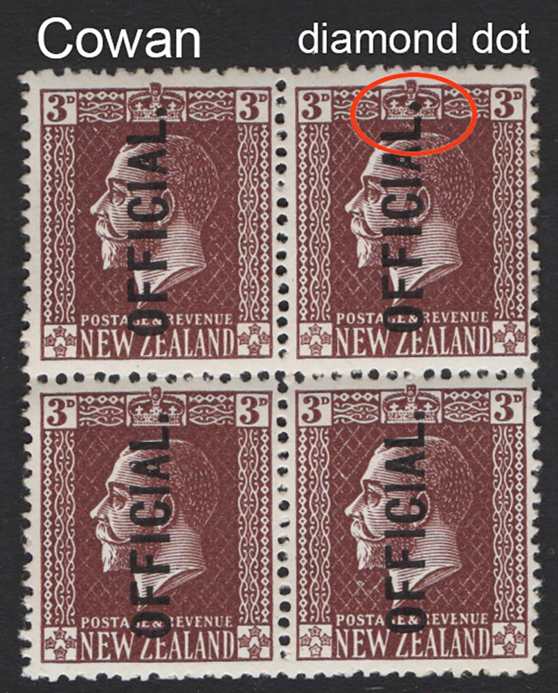 New Zealand 1915 3d chocolate Official Cowan paper sgO99 fine mint block of 4 (2x um) VARIETY one with a diamond stop instead of rectangle cat £80+ [ref 291-933/sa/ai0392]