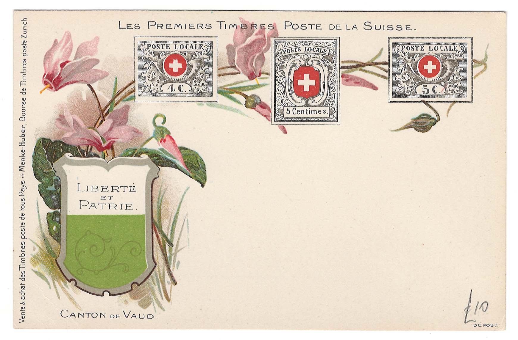 #936 Switzerland PPC depicting 3 early Canton stamps, CANTON de VAUD, fine