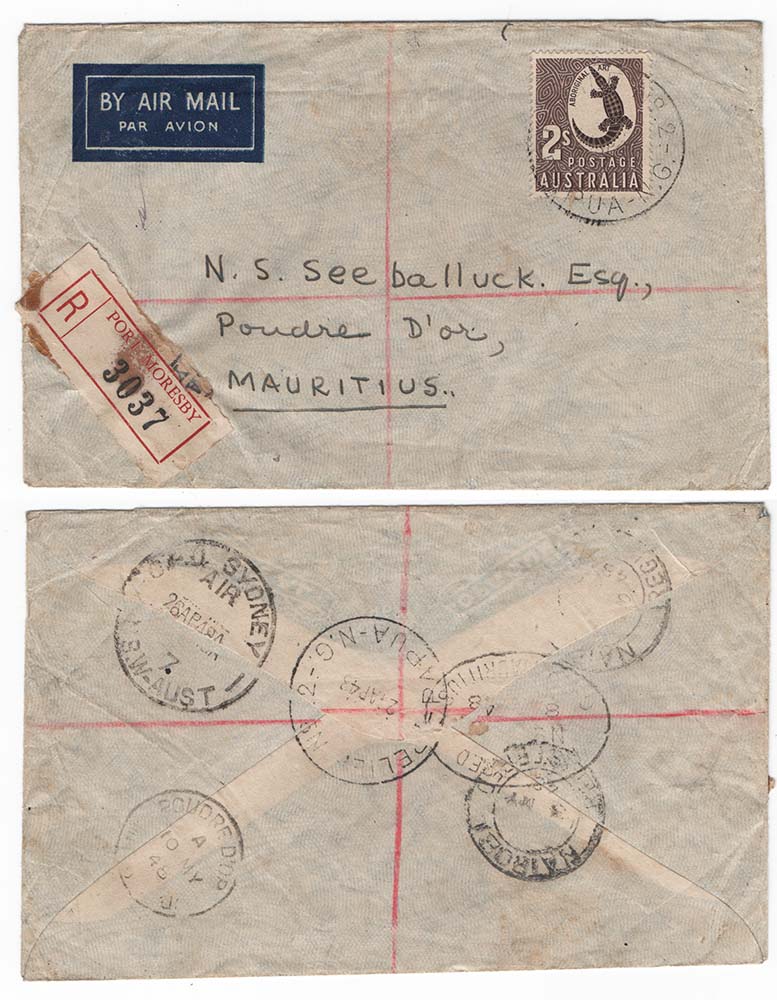 Papua New Guinea 1948 Neat registered airmail cover from Port Moresby to Mauritius via Nairobi, franked Australian 2s crocodile [ref 291-943/l/ai0204]