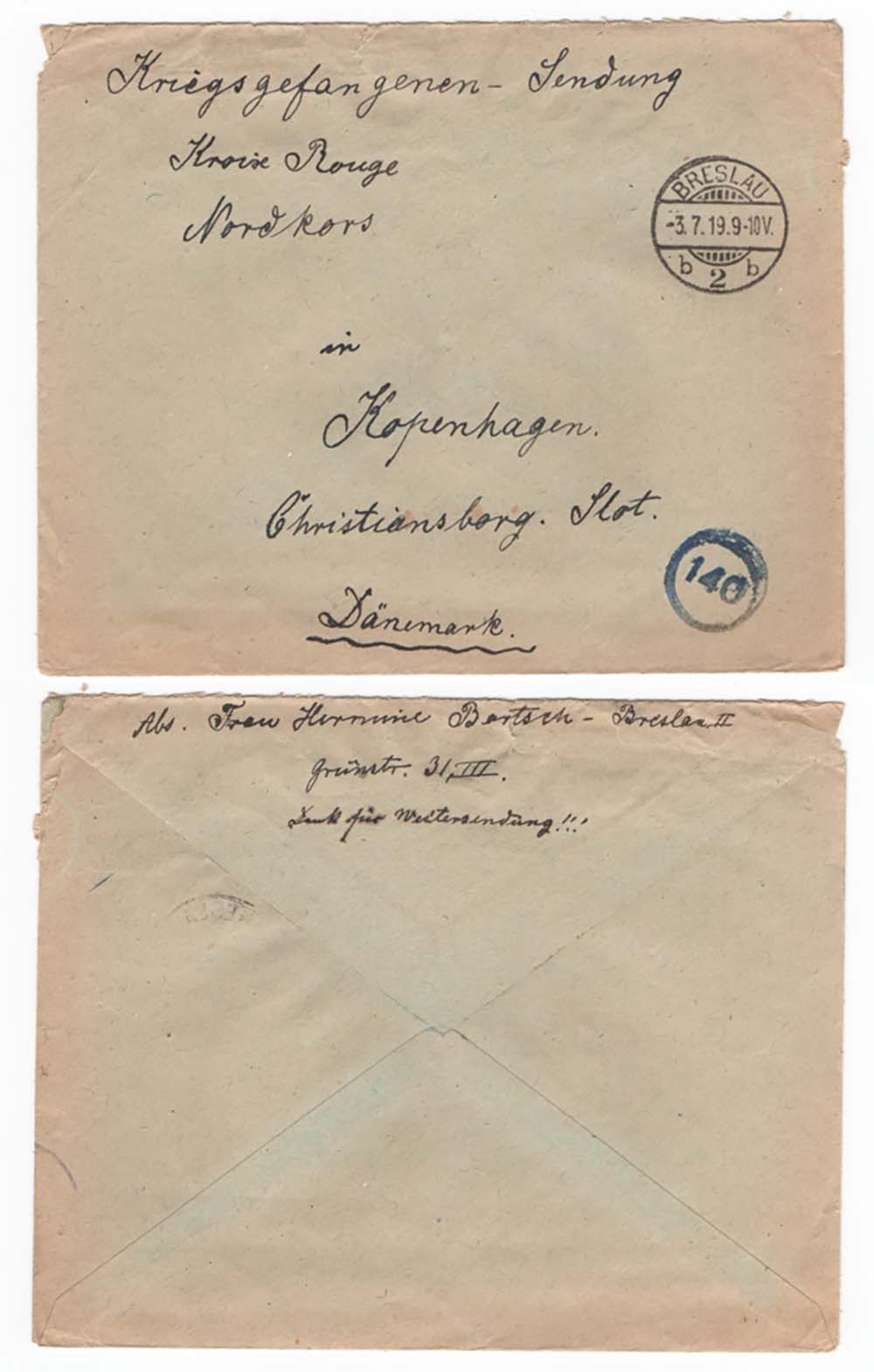 Neat Cover Breslau POW Camp to Red Cross Copenhagen Denmark WW1, 140 in circle marking
