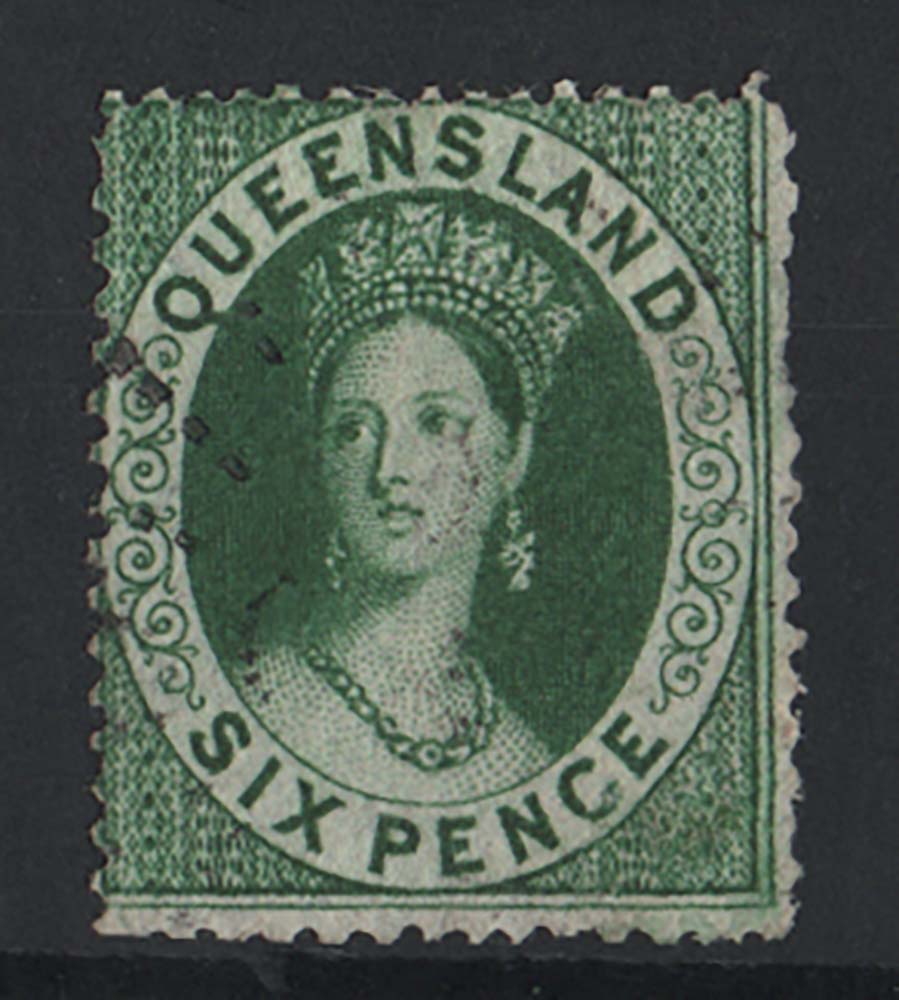 Queensland 1860 6d green watermark large star perf 14-16 sg5 fine used cat £95 [ref 291-951/sa/ai0546]